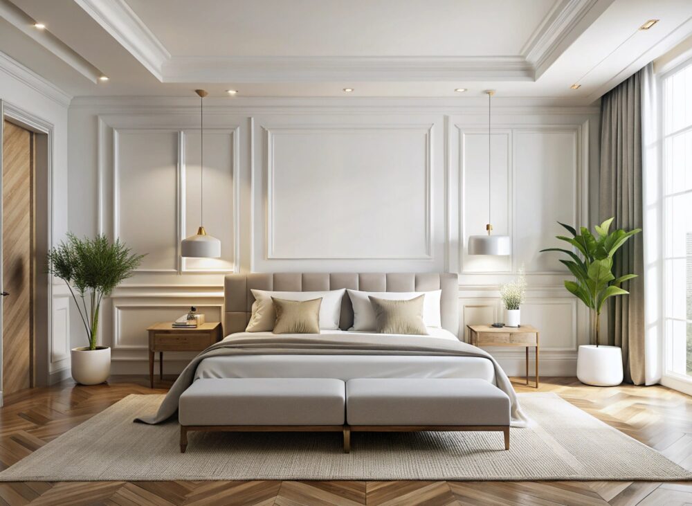 Bedroom: Soft neutral palette with bespoke joinery.