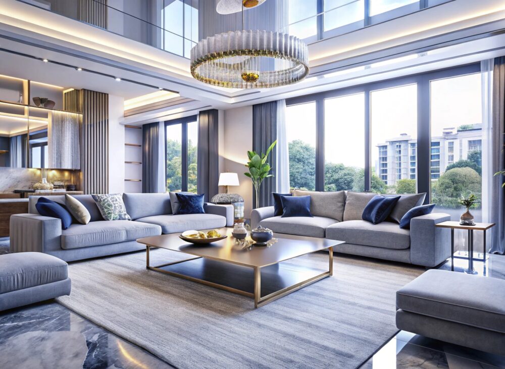 - Flexible Workspaces: Modular furniture and glass partitions for adaptability.